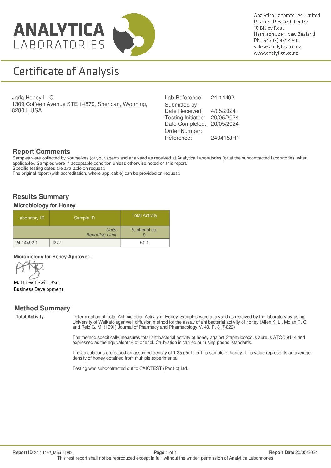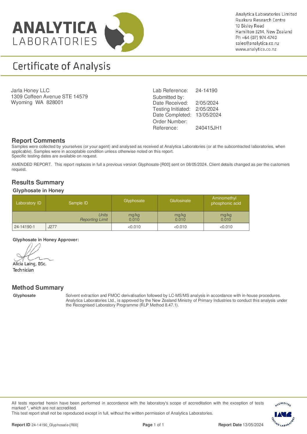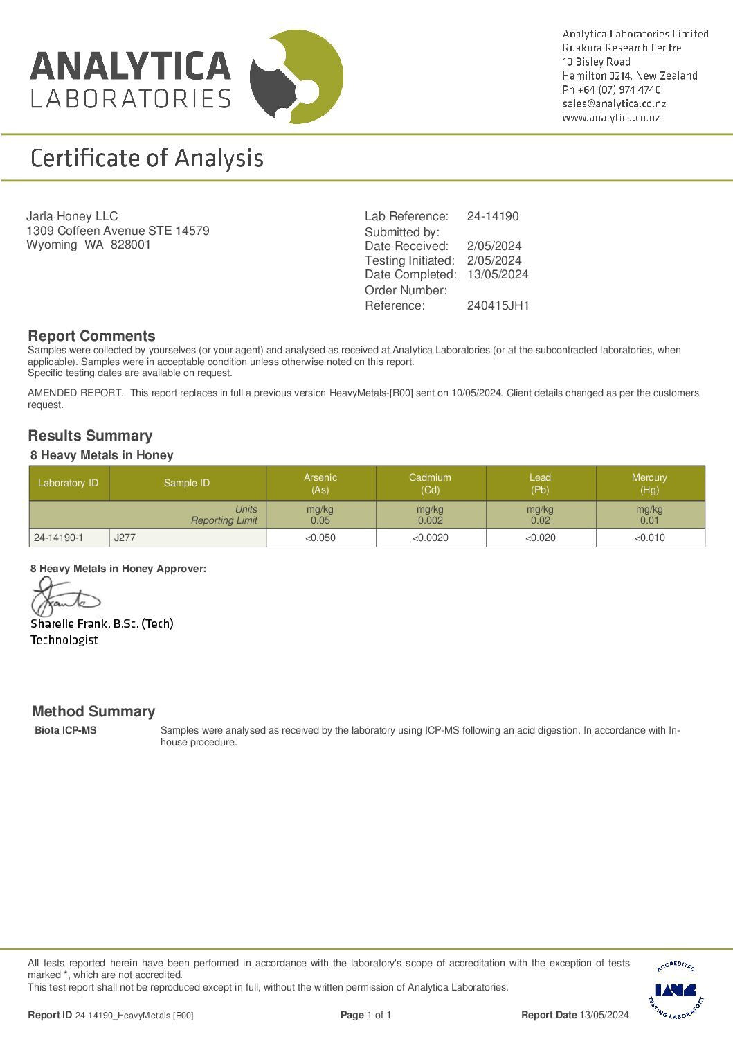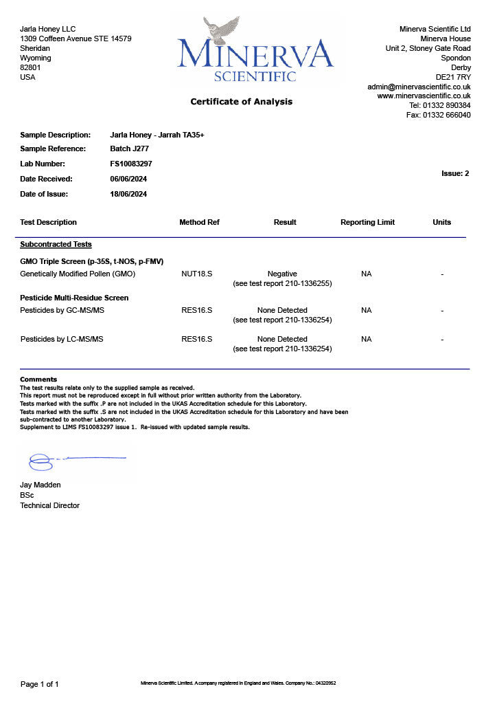 WE LAB TEST EVERY BATCH OF OUR HONEY TO ENSURE BIOACTIVITY AND PURITY (FREE FROM GLYPHOSATE, PESTICIDES, HEAVY METALS & GMO POLLEN). PLEASE CLICK ON EACH ICON TO SEE TEST RESULTS FOR BATCH J277.